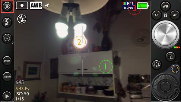 You'll want to, first, tap the upper left icon (in the screenshot above, annotated by a red rectangle) to show the circle with “1”. If you don't do this, the first image will always use center metering. After tapping the icon, it becomes draggable. In the above screenshot, as the center of the screen is very close to one of the bulbs, the first shot would have been almost as under-exposed as the second one. This is why I've explicitly displayed circle Nr. 1 and dragged it to a less-lit area – but paying attention to not drag it in the darkest area. After all, circle Nr. 3 has already been dragged there.)