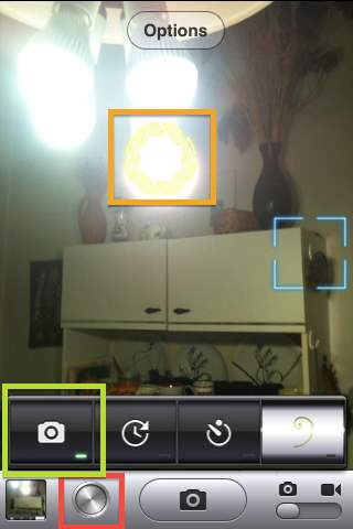 Note that I've also drawn two other rectangles on the above screenshot. The red one (right at the bottom) shows the icon CameraTweak adds to the standard icon bar of Camera. You must tap it in order to make the icon row immediately above the standard bar visible.