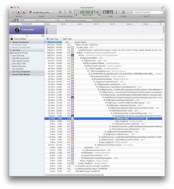 Performance profiling (in Xcode, via Product > Profile > Time Profiler), on the other hand, can be very handy (just like on the ARC-enabled iOS too). Two example screenshots of the non-ARC-based app (see next section) instantiating NSDate in a loop; first, the loop running 100,000 times and, then, a 10,000,000 times. In the first case, the loop was in charge of 7.9% of the total execution time (see the “Running time” column); in the second case, 34.5%.