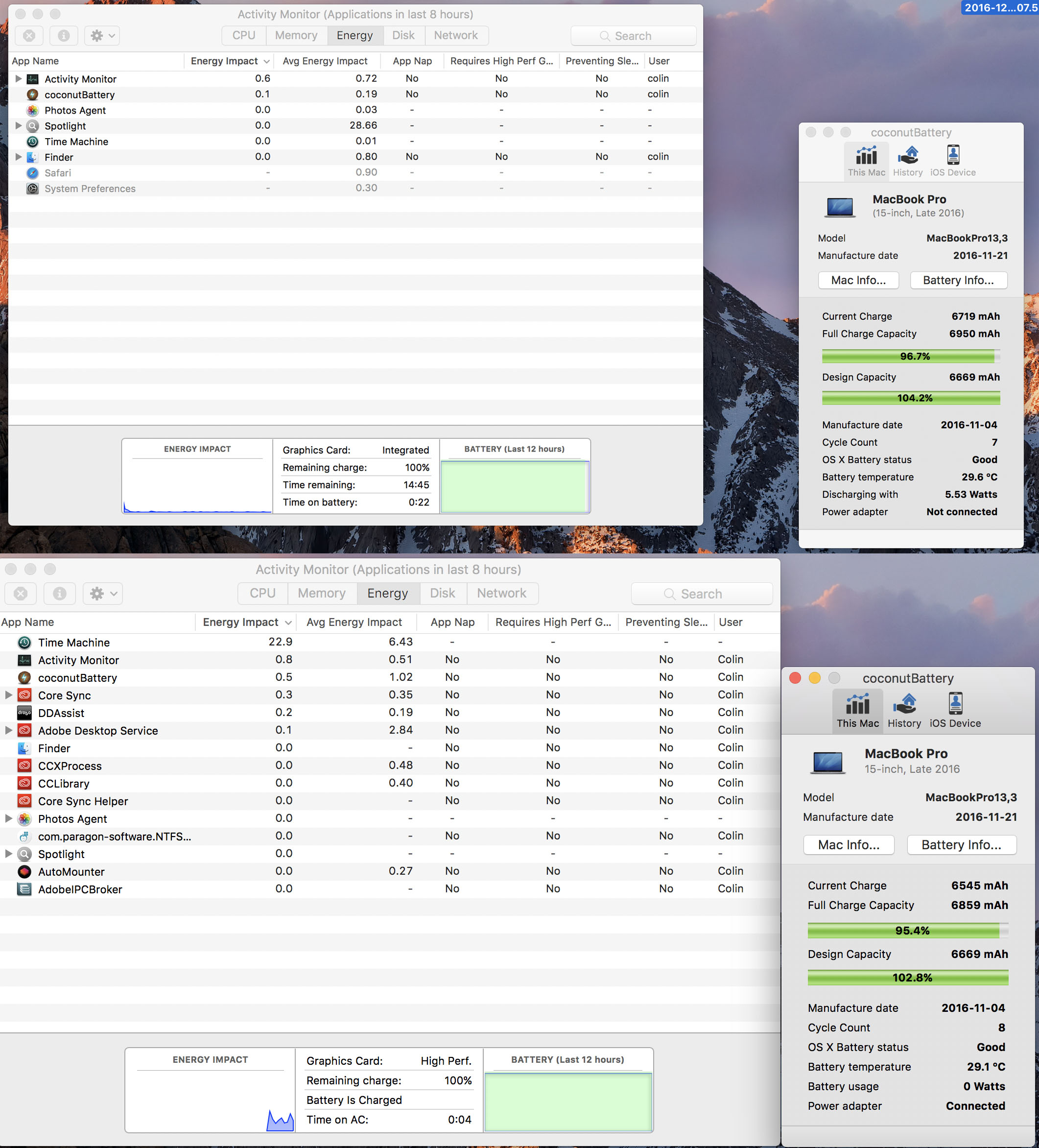 (yes, for some reason the graphics card is on high, which appears to be from an external monitor being plugged in - but I'm just web browsing and messaging mostly so I can't see why it would be taking up so much energy just to send a video signal. The monitor has it's own power, obviously. )