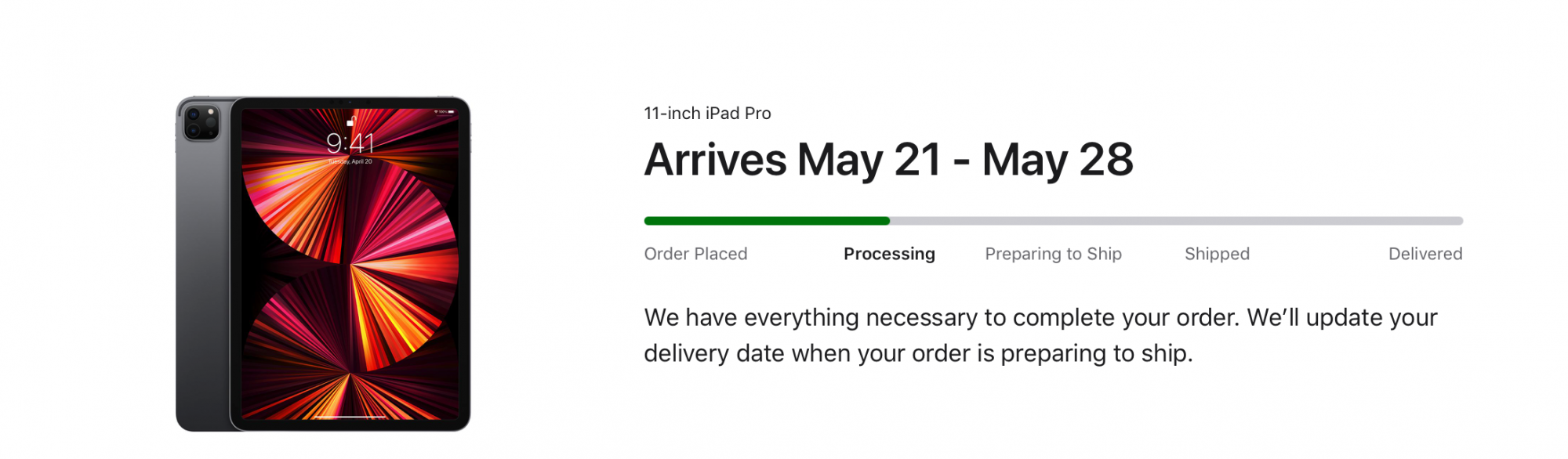 Yay just got my notice! Delivers 21st!No ups and still pts for my 11” 256gb 😭 ordered 4/30 at 5:13am