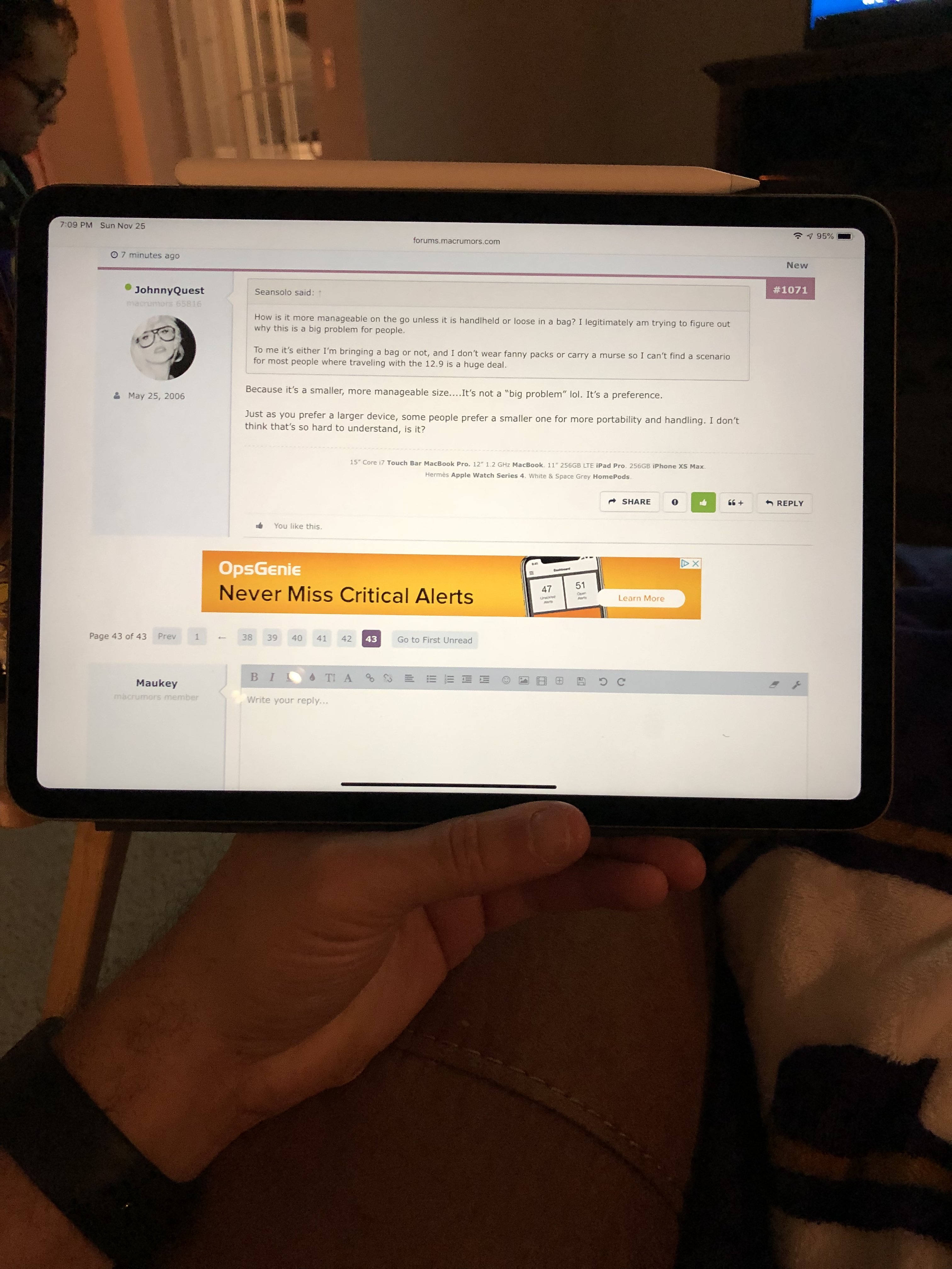 I think what many are saying is that the smaller form factor of the 11” is more convenient in some scenarios. For example, here’s me holding my 11” as we speak while reading this thread....