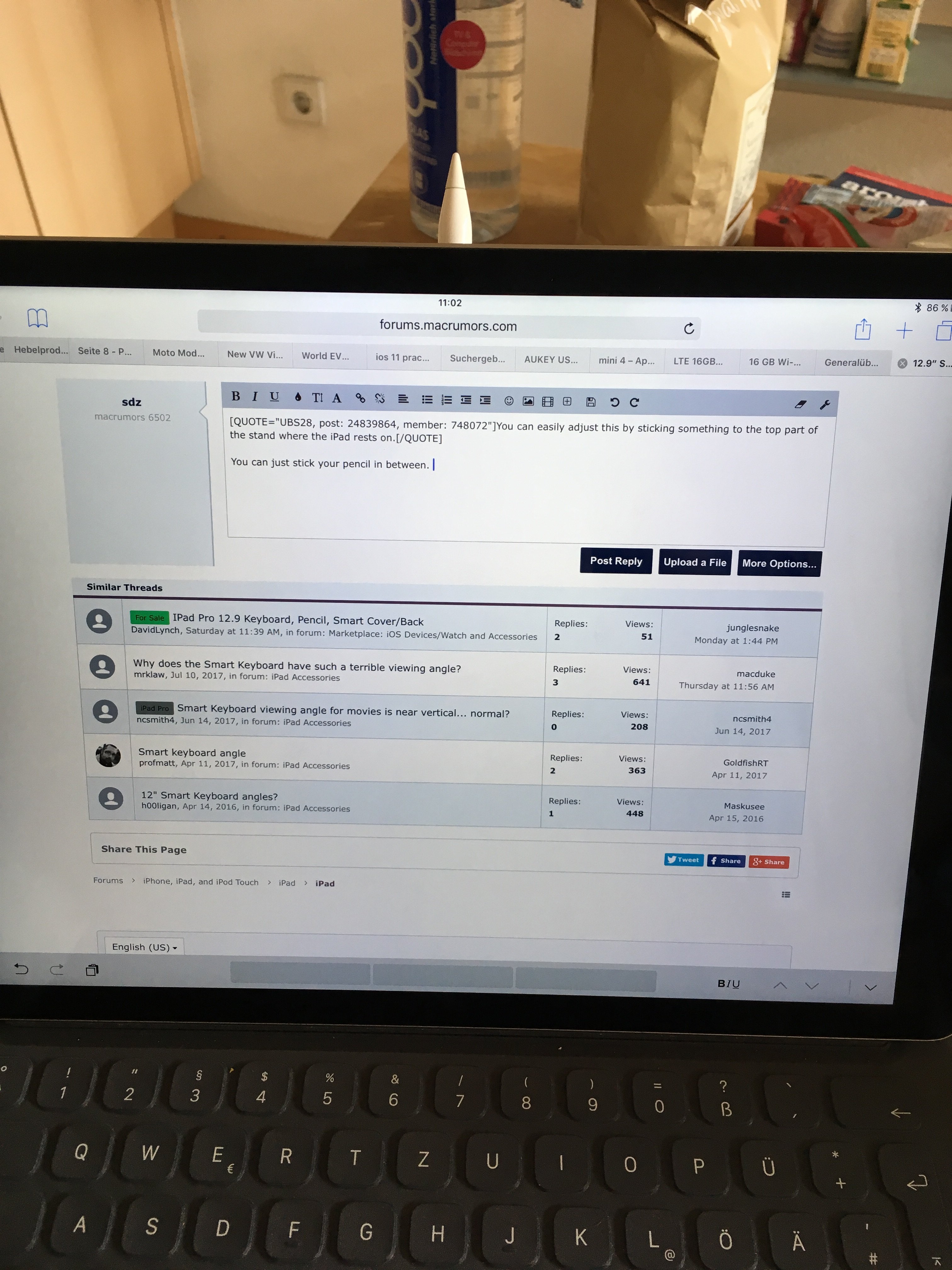 I feel the tilt on the 12.9 Smart Keyboard is too far back for best viewing angle. Think it needs to come forward 1-2cm at least. Considering making some sort of wedge but would want to fix it to the case in a non-destructive way.