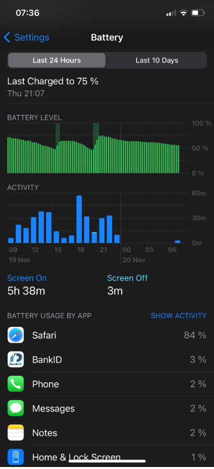 This in a screenshot of the battery consumption this night on my iPhone 12. It went from 69% -> 56%, a 13% loss between around 23:50 and 07:00. At the same time my wifes iPhone SE (First gen) dropped 1% and my work Android, two years old also only lost 1%. And I have NOTHING running in the background on my iPhone 12.