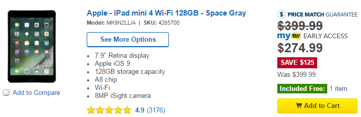 Best Buy is running a sale on the Mini 4. Looks like a good time to buy for those who are considering a Mini 4. $125 off is an excellent discount on a $400 iPad.