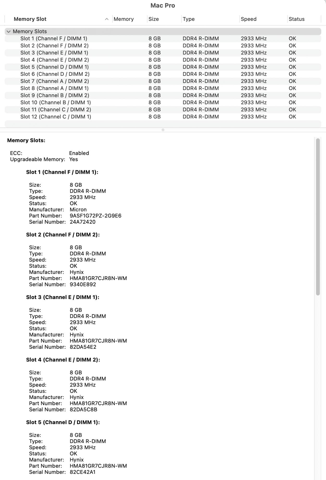 Thankyou, This is great info, SteveI have all twelve slots filled with 8GB dimms. Eleven are Hynix brand and one is Micron (in slot 1). Working fine.
