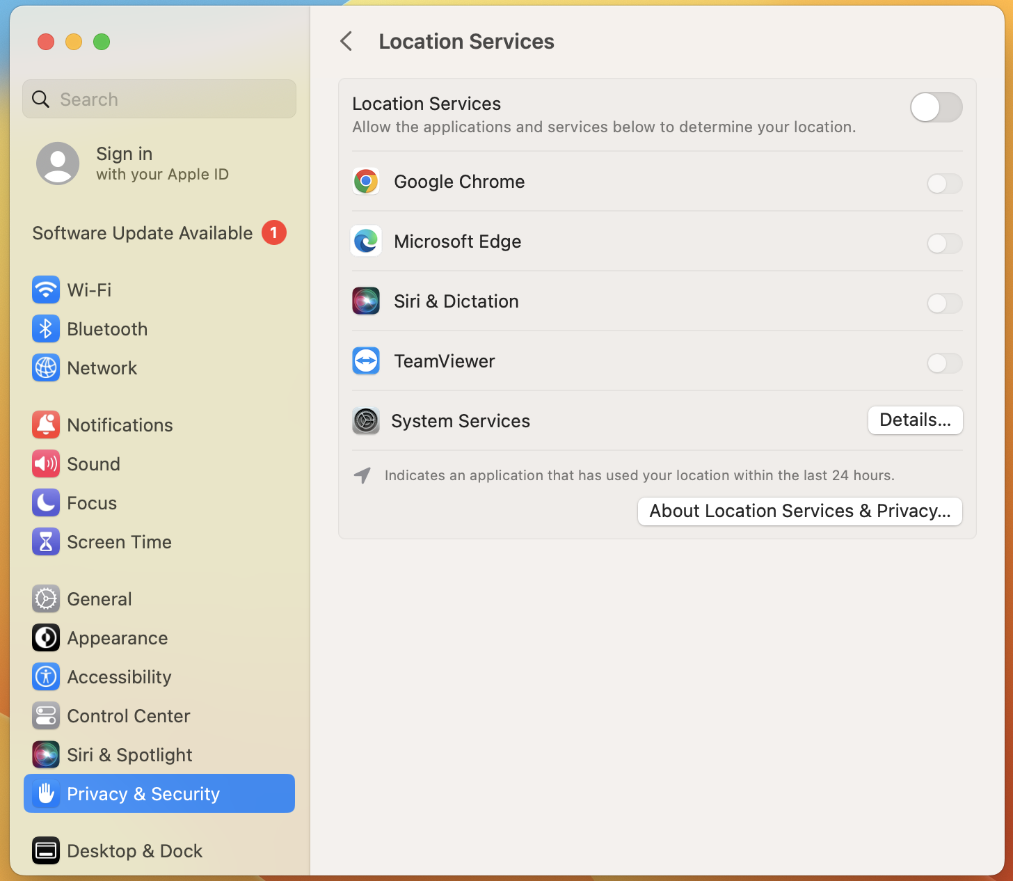 On both my Pro and Air, apps no longer show up under Location Services under Privacy and Security.
