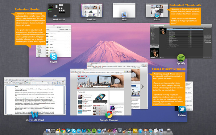 - The grey border is redundant and only adds more need for processing power to animate the entire process of Mission Control activation. Wallpaper should be fullscreen, just as it was in Snow Leopards Expose with a vignette.