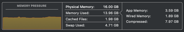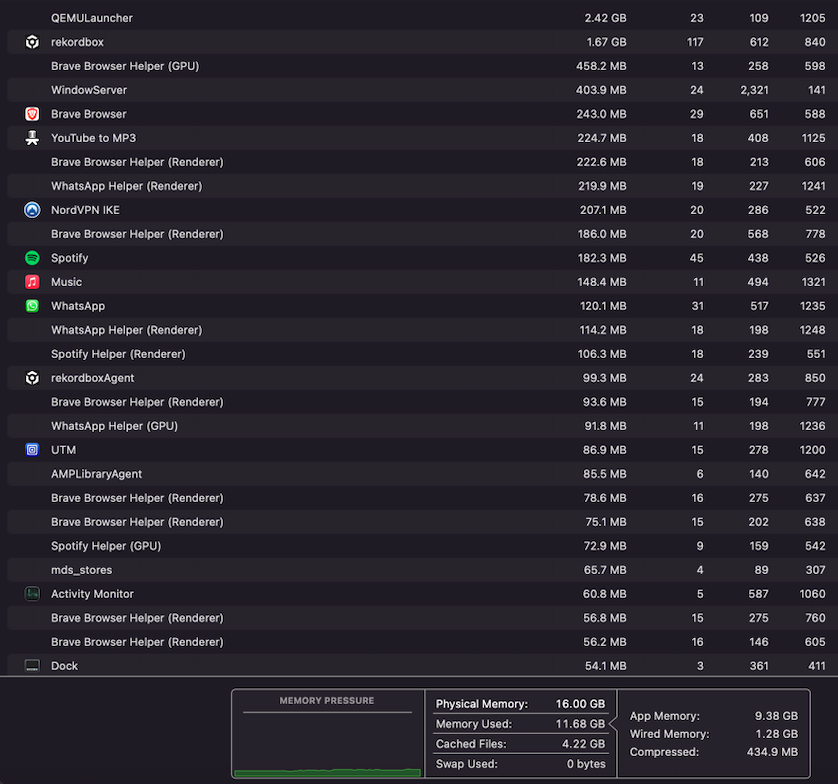 Attached my memory pressure and activity monitor below which consisted of the following: Rekordbox with some decks hooked up whilst actively mixing and powering the decks through my laptop, downloading 7/8 songs in the background on Mediahuman (although this happened absolutely lightning quick in comparison to my 2015 MBP (10 seconds vs about 2 mins) so not even sure it made a dent in the RAM pressure), had open Spotify, Soundcloud (app via Brave), Brave (about 5 tabs), Whatsapp, VPN, hooked up to a standard 23" HD external monitor.