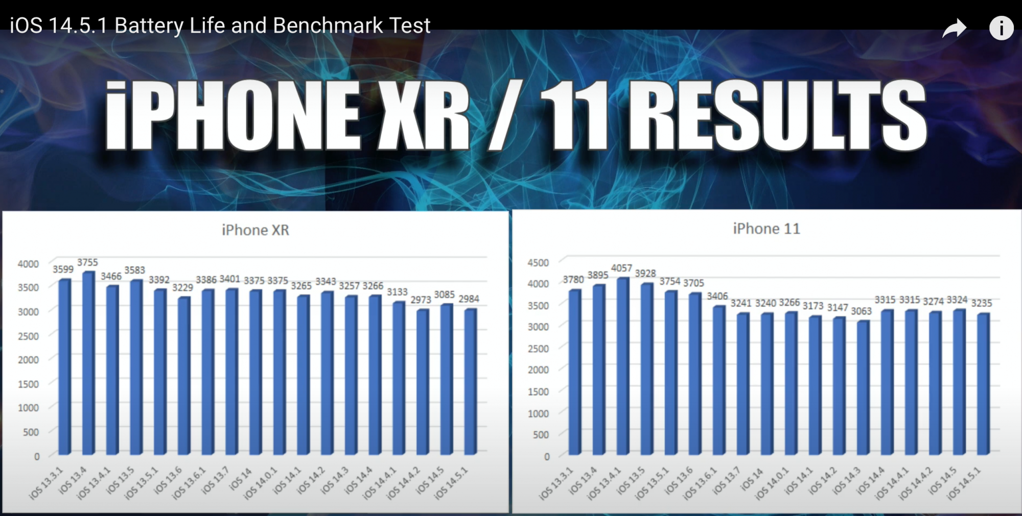 I was curious about the testing methodology so had a wander over to this channel. Looks like they don’t account for battery age, so all other things being equal battery life will decrease over time anyway.based on iAppleBytes battery testing method, iOS 13.4.1 had the best battery recorded, luckily my iphone 12 Pro Max downgraded a couple days ago to 14.5 due Multicore throttling issues with 14.5.1 and battery drain.