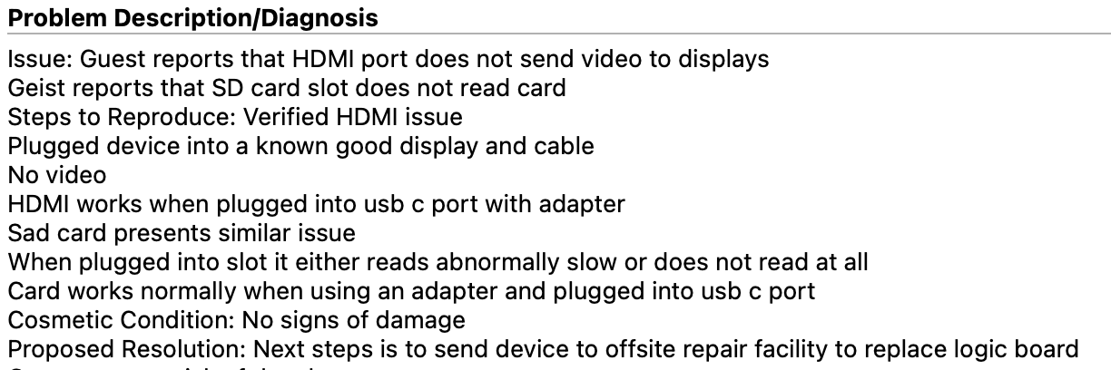 I also showed him the issue with the SD card slot. He said that according to their records an HDMI port failure is correlated with an SD card slot fault.