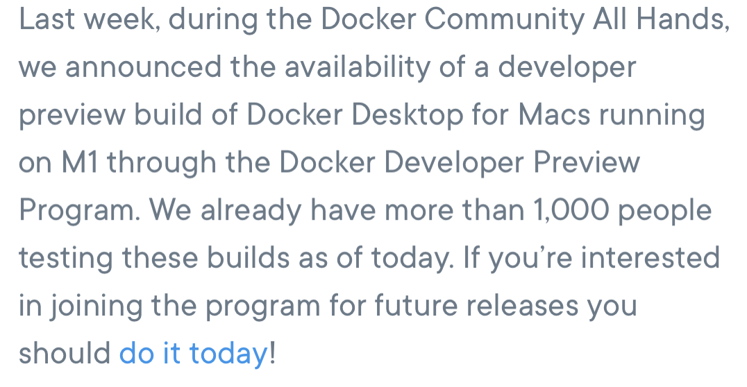 Add to those millions of everyday users the 1000+ that are using Docker’s Dev Preview build for M1 Macs: