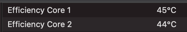 How many degrees is the temperature of the 2021 M1 Pro 16GB CPU Efficiency Core 1 if no process goes? I use macs fan control