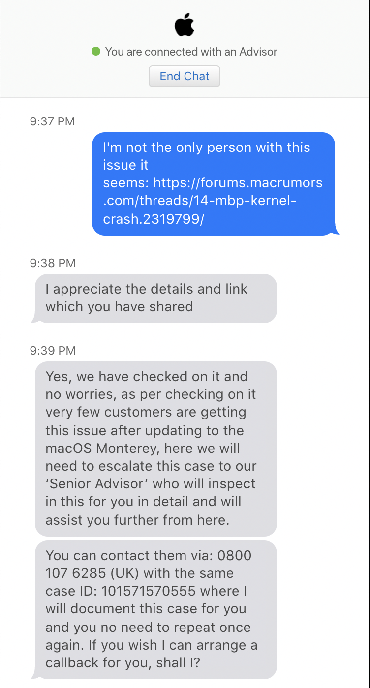 I haven't seen anyone else report this type of thing here yet. What version of macOS are you running?I've had a number of kernel panics on my new MBP 14" in the last couple weeks, particularly when using Airpods Pro with multiple Apple devices at once (14" MBP, iPad Pro, and iPhone 13), and with Zoom on multiple devices simultaneously.