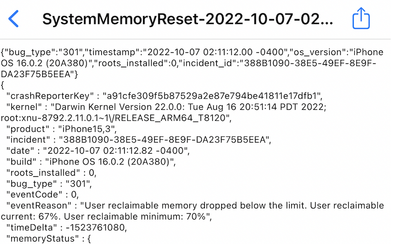 3) My analytics do not show any panic messages, the two pictures below are the closest to what likely happened. I don't know much about these messages, but one is a SystemMemoryReset, one is a ResetCounter. I have multiple of both messages in the Analytics.