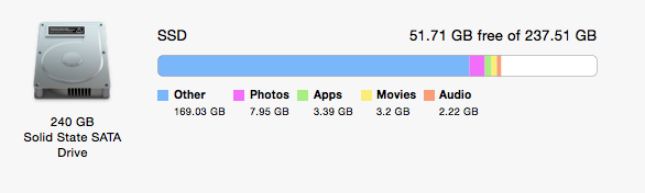 Hey, folks! The "other" category on my Early 2011 mbp is out of control. My Crucial SSD 240 gb is reading that it has 140 gb in other.