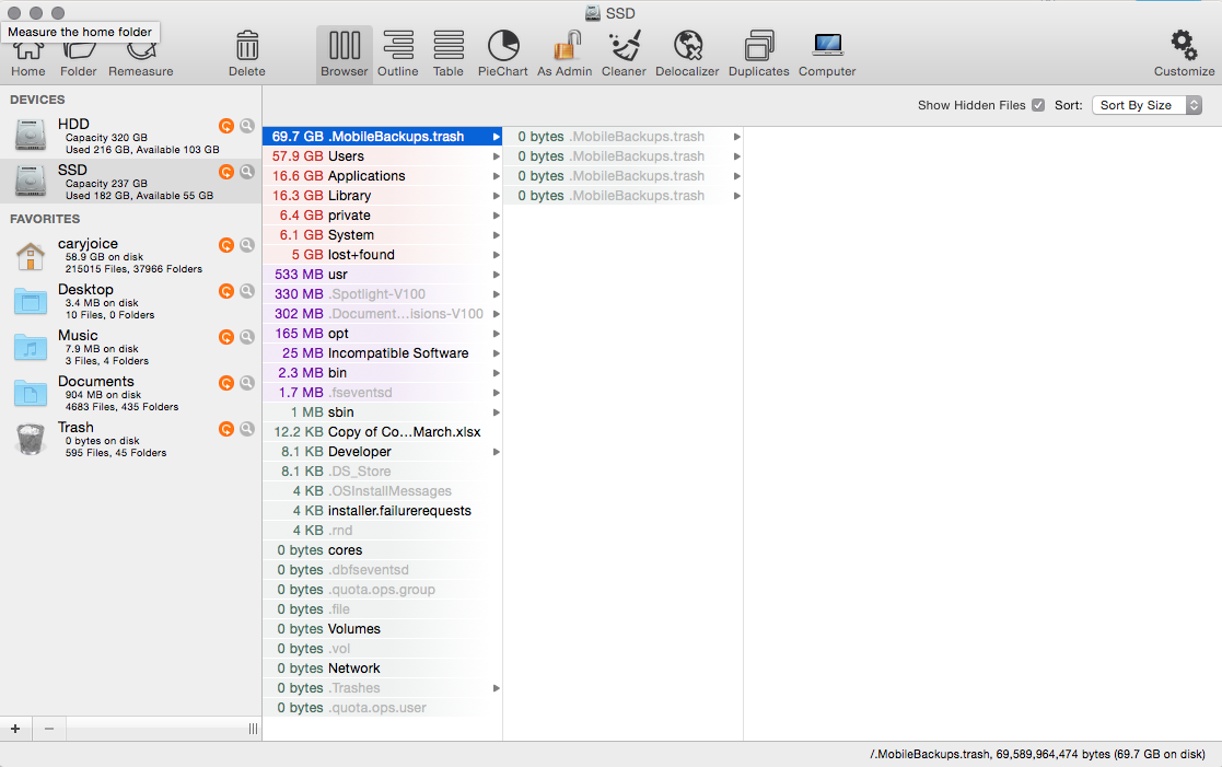 - using OmniDiskSweeper, Disk Inventory X, and WhatSize to scan my SSD looking for large files. All remaining files make sense.