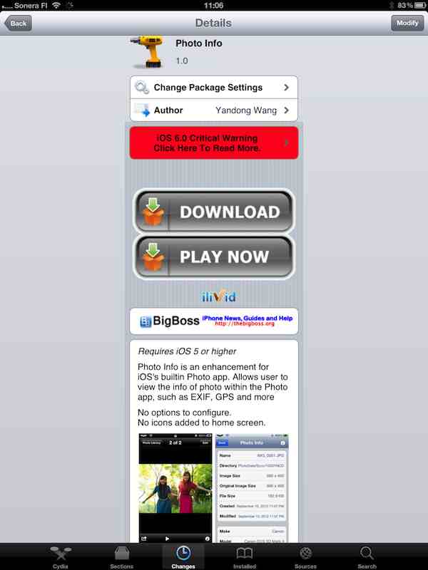For the Cydia community (that is, only for JB'n devices!), a brand new, free(!!) tweak, “Photo Info”, has just been released. A Cydia screenshot: