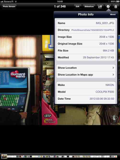 So far, it was impossible to display the EXIF information of images in the Camera Roll. All you had a big map under the Places tab, where you needed to find your current shot, which in some cases (you don't exactly remember where it's been taken AND you have several photos on your handset) was impossible. The ability to review EXIF info? To quickly look up the location of a given still shot? All painfully missing from the built-in, stock Photos app. All you could do was using third-party and, in most cases, non-free apps like Apple's iPhoto (with its, in many cases, useless, OpenStreetMap-sourced map) or (the, for this reason, pretty good) Photo Manager Pro. This, however, requires you to use third-party apps, sometimes with the additional hurdles of having to import the image to the app (which may take a lot of time) before being able to check out its EXIF / location.