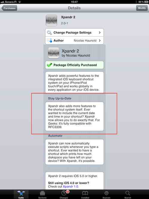 (Cydia main page, also shown under Manage Account > Installable Purchases. I've annotated the part of the description explaining it's also fully compatible with RFC 3339 timestamp definition templates.)