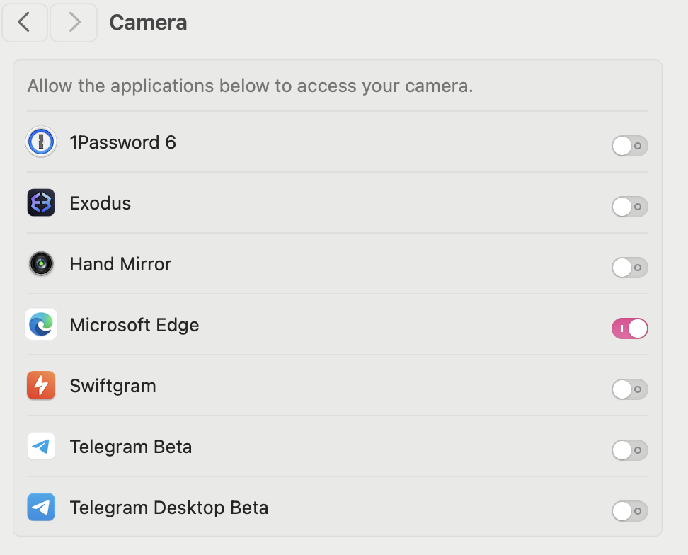Does anyone else encounter the same issue as me, where other apps can’t access the camera? I’ve tried using Meet and Edge, but I don’t have any place or option to grant them access to the camera.