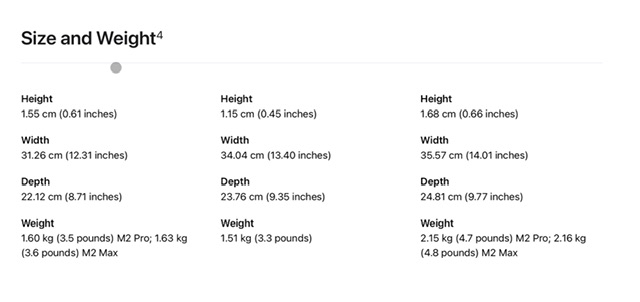 Fast forward to a month ago when the 15" M2 MBA was announced. I looked at the weight, I saw that it was essentially the same as the 14" M1 MBP that I had already decided was not enough of an improvement in weight and bulk over my 16" MBP. And, following the price drop on the 13" M2 MBA, I found the Siren Song too hard to resist and bit the bullet on a 13" M2 MBA 16/1TB. Now that I've had it for a couple of weeks, I've concluded that for someone like me who was looking for power with extreme portability, the 13" model is the way to go.
