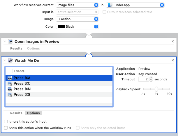 It seems like something that could be easily done, I just don't know how to do it. Automator will open the image in Preview, but from there I don't see how to enter: ⌘a, ⌘c, ⌘n, ⌘s