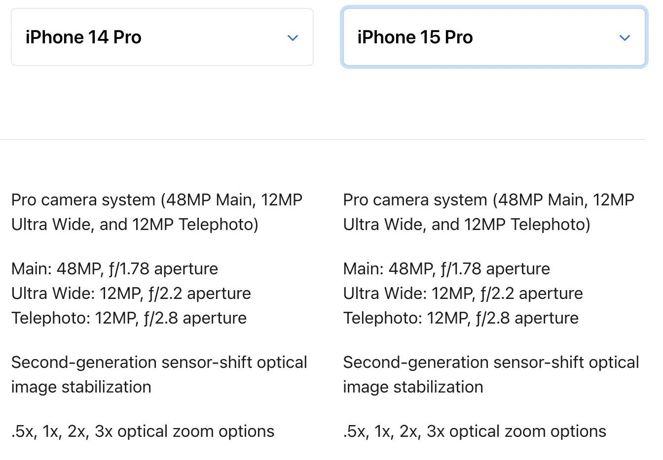 The rumors are pointing to big camera upgrades next year with the 16 Pro/Pro Max. Looks like any camera “improvements” with the 15 Pro will be mainly software related. I guess we’ll have to wait for the reviews, especially those that focus primarily on the camera, before we can verify that the 15 Pro camera hardware is basically the same from the 14 Pro.