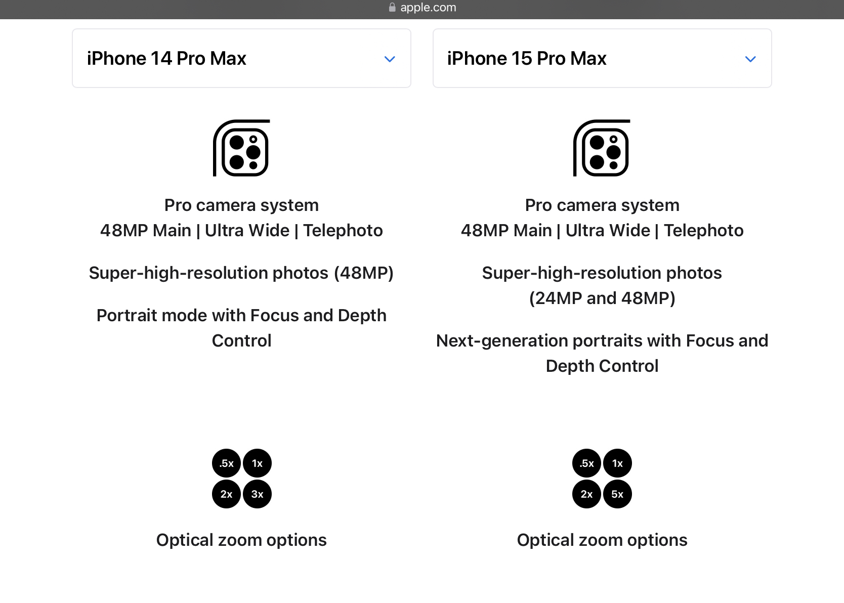 I saw this on the Apple website and it states the same optical zoom lens as the iPhone 14 Pro, both listed as 0.5x, 1x, 2x and 3x. Is the 5x options perhaps some some software added option? I think they mentioned something about the light bouncing around in the lens. So that might mean that it is the same 3x optical zoom lens with 5x being added to that? As some where saying here that that the 3x got removed in favor of the 5x. Maybe somebody can clarify 😊