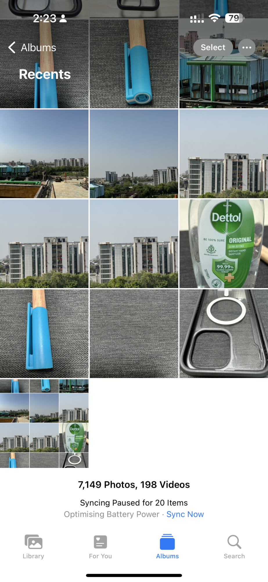 3. Syncing paused....... "Optimizing Battery Power". Still persisting for over 8 mins. Took a screenshot.