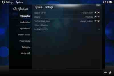Back to the 12-series: Here, at System > System > Video Output, change the default (annotated) Full Screen #1 to Full Screen #2 by tapping either arrows. (You'll only be able to do it if you connect the VGA / HDMI cable before starting XBMC; if XBMC's already running, just kill and restart it.).