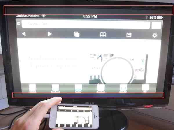 In this case, the iPhone's screen is mirrored using a decidedly lower resolution than it otherwise would be possible with a Full HD monitor. The latter is pretty much the norm nowadays – at least when it comes to LCD monitors. (Most projectors still have lower native resolution.) This results in the thick black bars in the mirrored picture. I've even annotated the lower and the upper ones in a slightly edited version of the above shot: