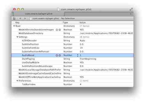 then, edit the plist file in a plist editor. On a Mac, Xcode's default editor will work just fine; on a PC, you'll want to use plist Editor for Windows. You'll need to change Settings>AudioBoost from “1” to, say, “4” if you want 400% boost. Then, transfer the plist file back to your iDevice, making sure you first delete the file before the transfer and don't try to overwrite it.