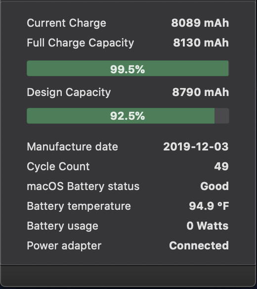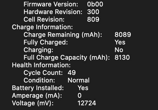 So I've been using my MacBook Pro 16" on a daily basis since I got it in February, and have racked up about 49 charge cycles. But I've noticed that the max battery capacity has dropped to the 8100s. I've used it while plugged in as well as off power intermittently (as the number of charged cycles may suggest).