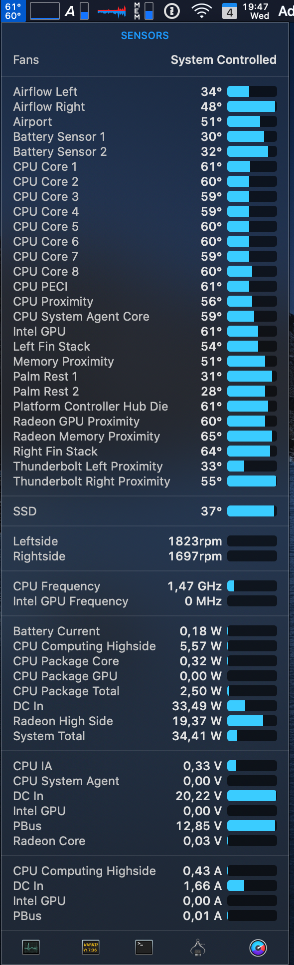 Concerning the fans: This time they came on at about the same time. Maybe the i9's kicked in a little earlier, but not much. Noise wise, they're the same. I lifted each of them to my ears in turn, a couple of times, and I couldn't tell a difference. When they are running at max power, they are significantly louder than the 13". But I find the noise acceptable.