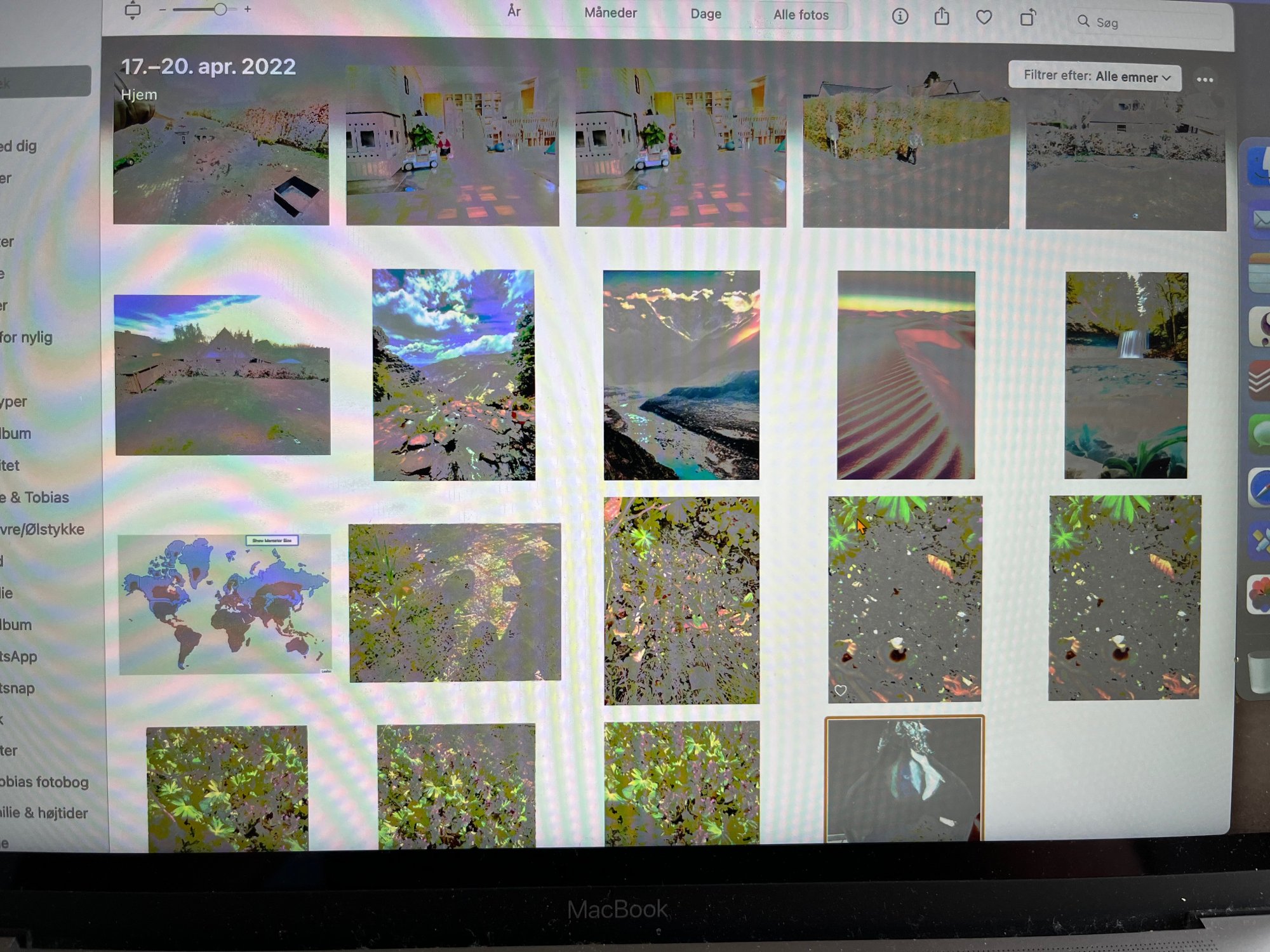 The display in my 2016 retina Macbook is starting to act up, and it has reached the point to being close to unuseable. The colors are all weird, and depending on how the display is moved, the colors change. Usually I can find an angle of the display where the colors are almost correct, but it has now gotten worse over time, and has now reached the point where that is not possible. I've attached a picture and a video of angling the display to show an example of how the colors looks crazy in Photos.