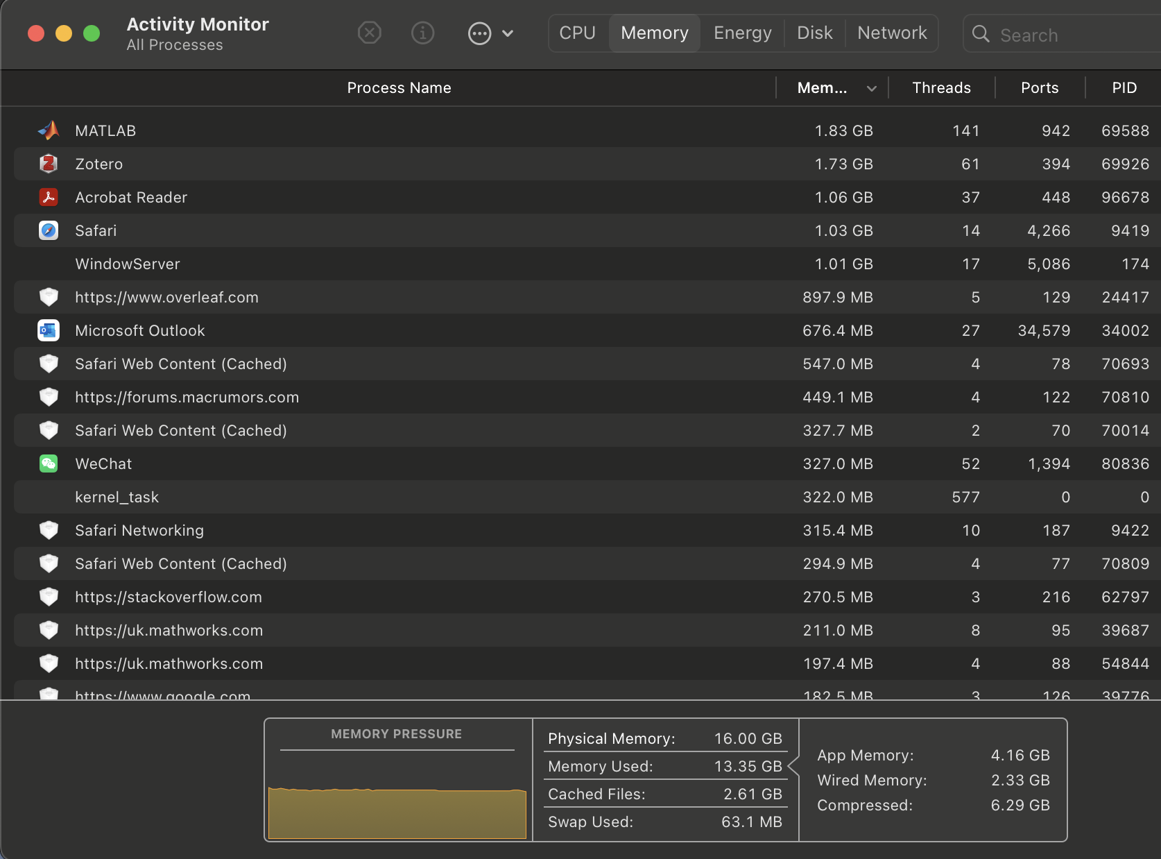 That screenshot suggests that MATLAB is a bit of an issue, though because you haven't sorted by thread use, it's hard to know if there's something up above it in the list, but with a 1.83GB RAM demand, it looks like this app isn't releasing RAM, so is actively holding the system high in load.
