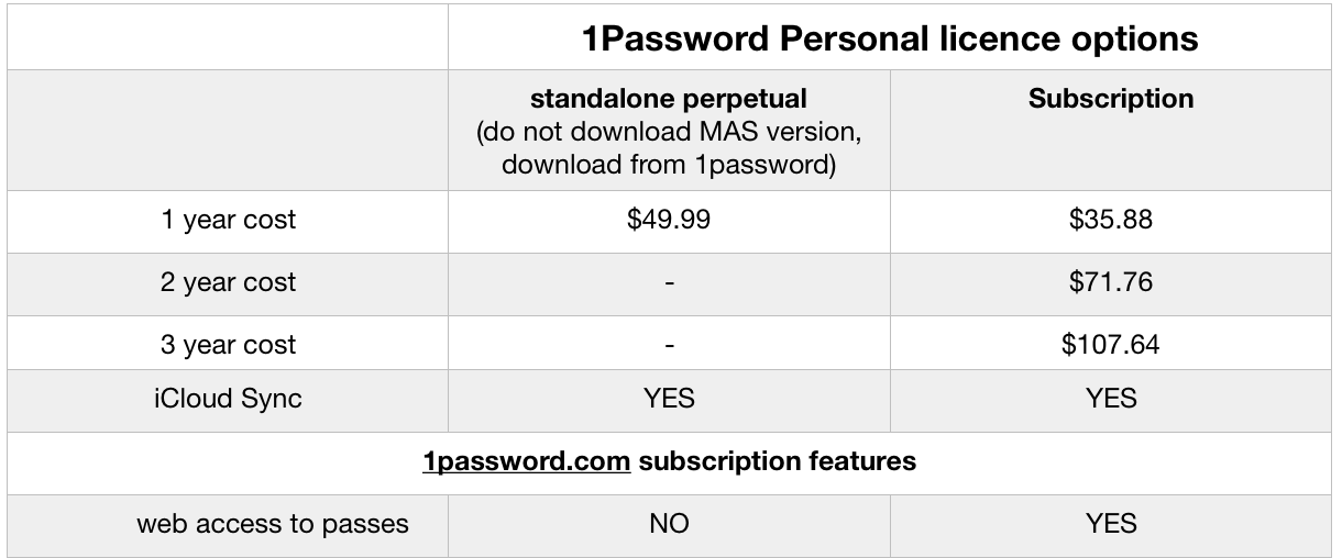 (so that's a perpetual vs subscription table and a 1password vs icloud comparison table).