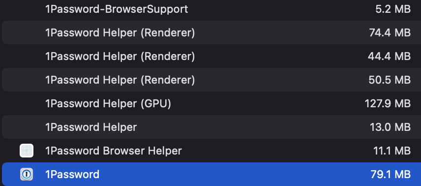 Worse even, that memory usage will likely grow indefinitely until you reboot. 1Password stays running, so resource management and low memory features are a necessity. When mentioning Electron and it's huge downfalls, I don't think most people are realizing this factor. If you keep the Mac Slack app running for work all day, like so many of us are stuck with, which is an Electron app, just watch its memory footprint and spawned processes throughout the day.