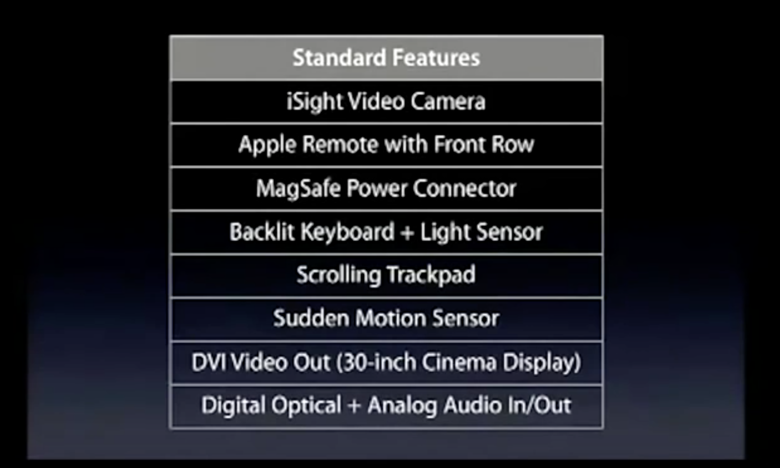 Of course, while being the fastest, it was also the thinnest and lightest MacBook Pro yet. The highlighted features include: iSight camera for conference calling, IR-receiver for Front Row and the MagSafe port.