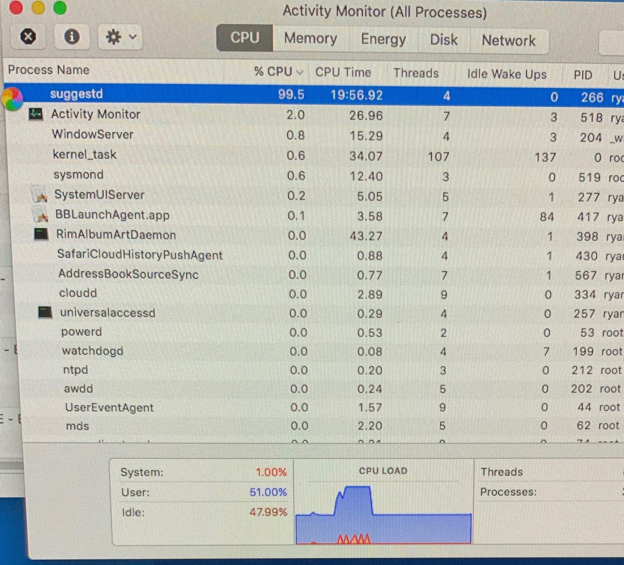 - This morning I managed to get Activity Monitor open before it became unresponsive and "suggestd" seems to be hogging a lot of CPU cycles. The attached photo (with beach ball) was taken 30 minutes after I tried to kill the process. 90 minutes later, it's still like that.