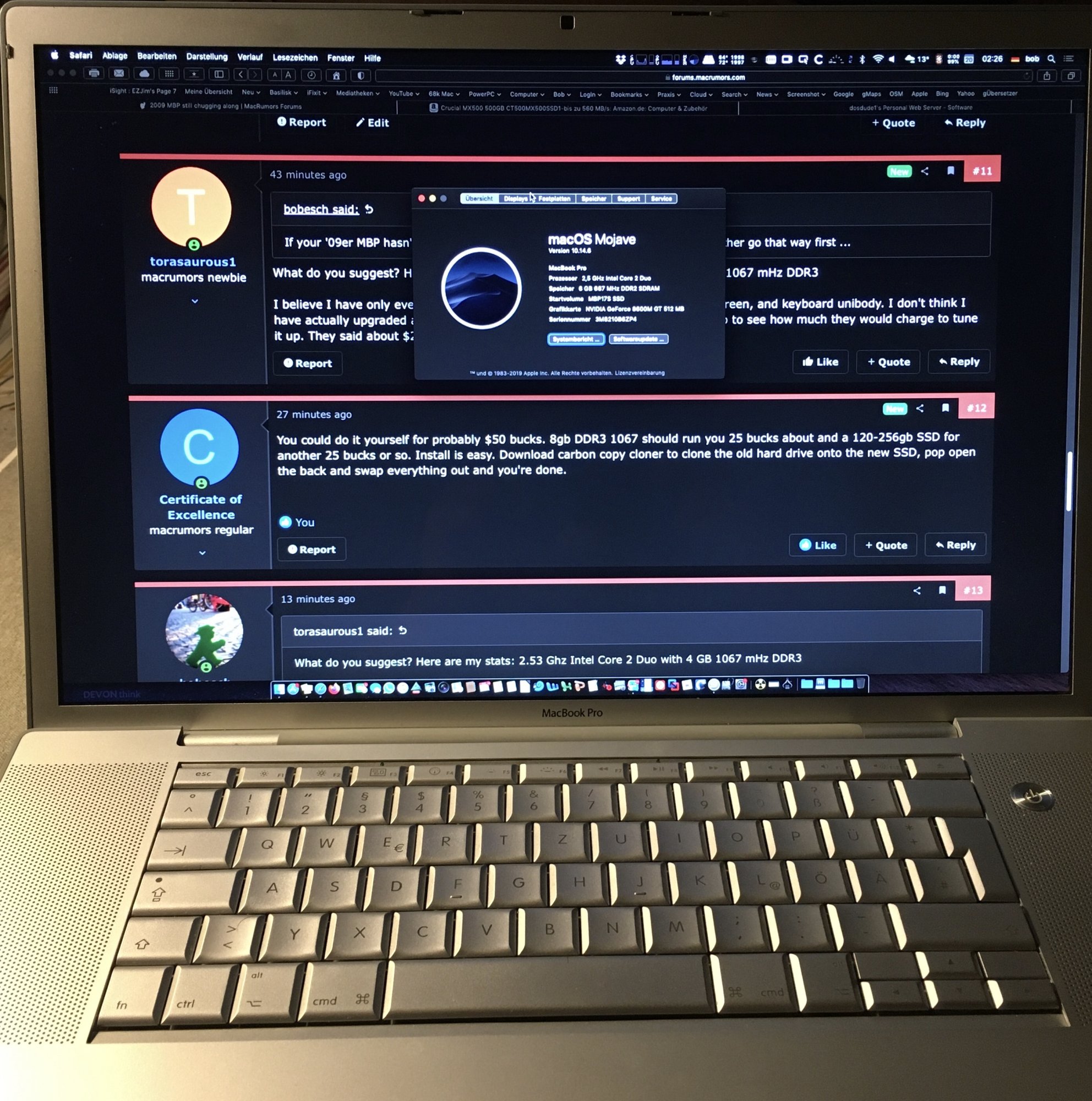My daily driver and favorite machine is a 17" early-2008 2,5GHz MBP with 6GB DDR2-RAM and 1TB SSD-drive.