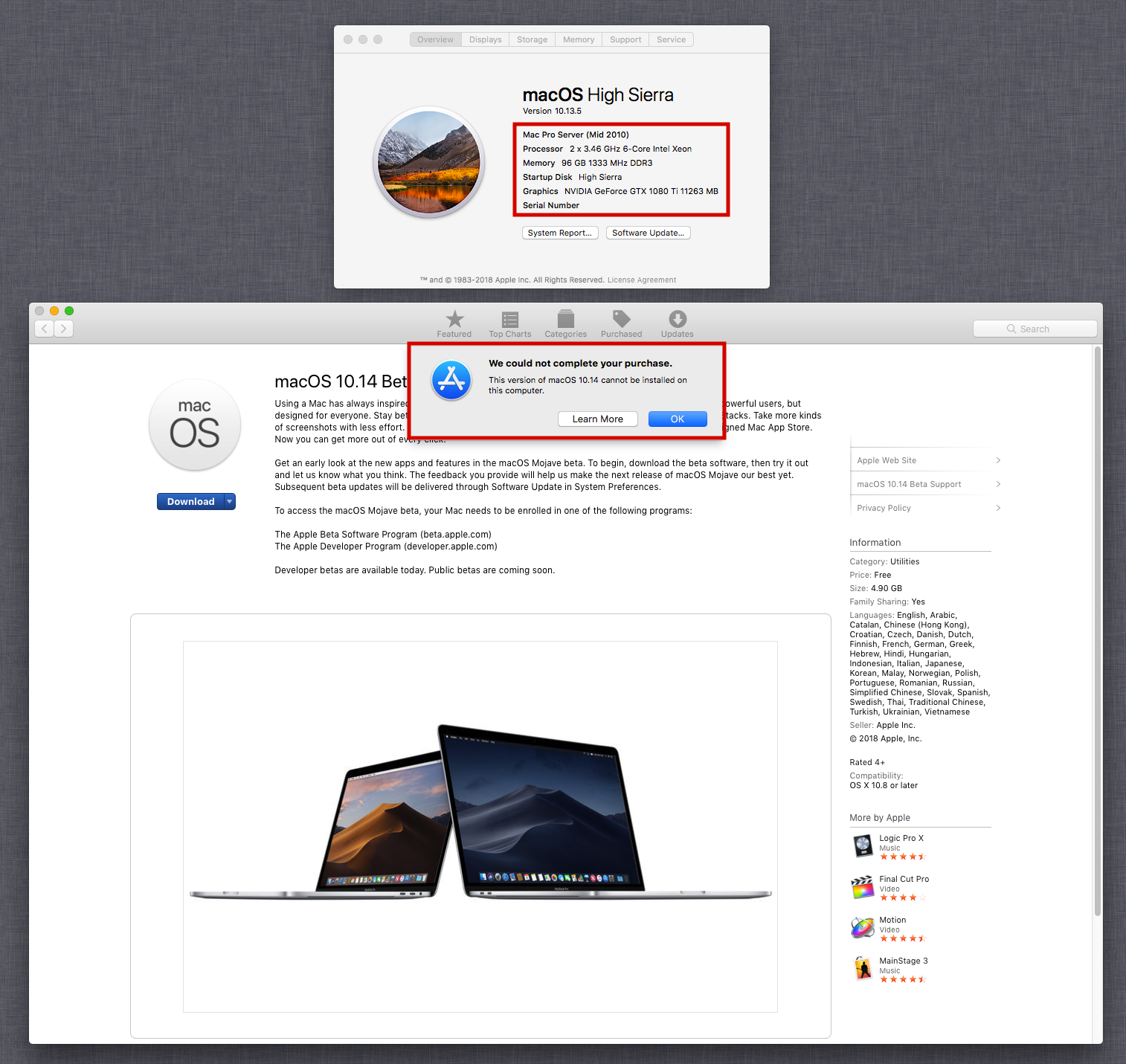 I tried to download 10.14 Mojave Beta using my 2010 5,1 cMP and got the message below.... Wouldn't even let me download the file.
