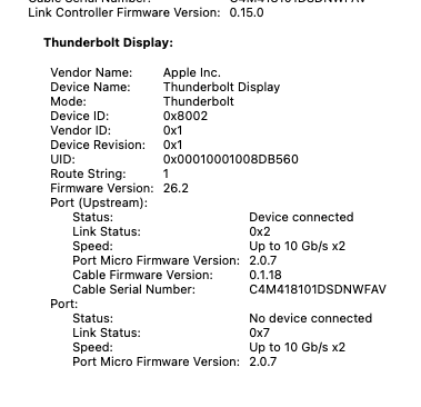 Anyway I tried the TB display on our Mac Air and it did not recognize the monitor either, but the power cord from the TB display did charge the computer and the USB ports worked. Therefore I'm thinking the PS is good and logic board is probably good, at least for the USB ports. When doing a TB H/W check on my Mac Air I got the following results, which I don't understand completely, i.e. Port Upstream status: Device connected & Port Status; No device connected.