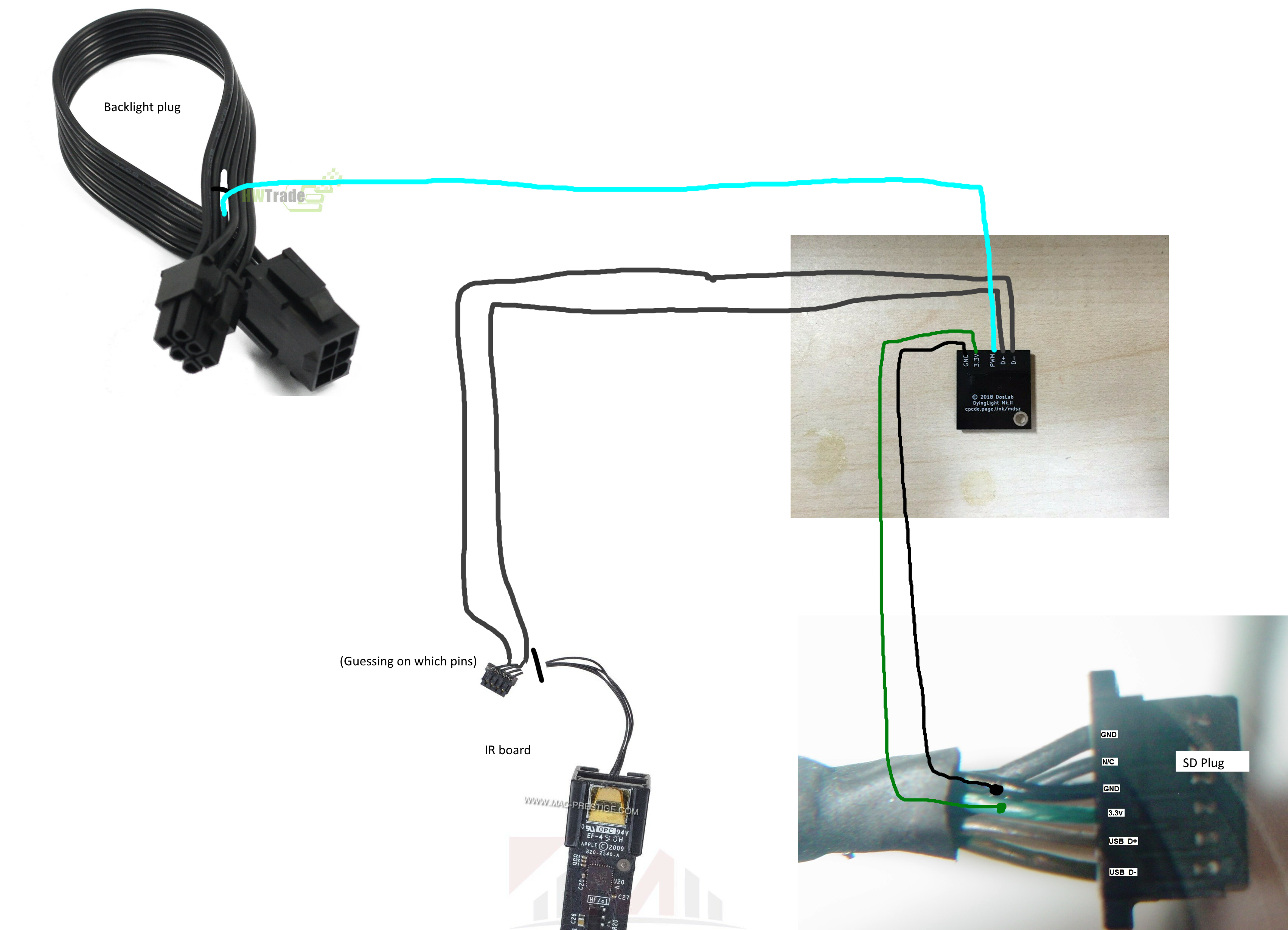 You just cut the PWM wire on the extension (at the female/socket end) and feed ~3v into it to fire the back-light, you can tap 3.3v from the Bluetooth / SD reader cable, or just poke the wire into the right hole (!) on the back of the main PSU connector, & secure with a zip-tie. The PSU pin is SMB_SCL, not really a power rail, but it works.