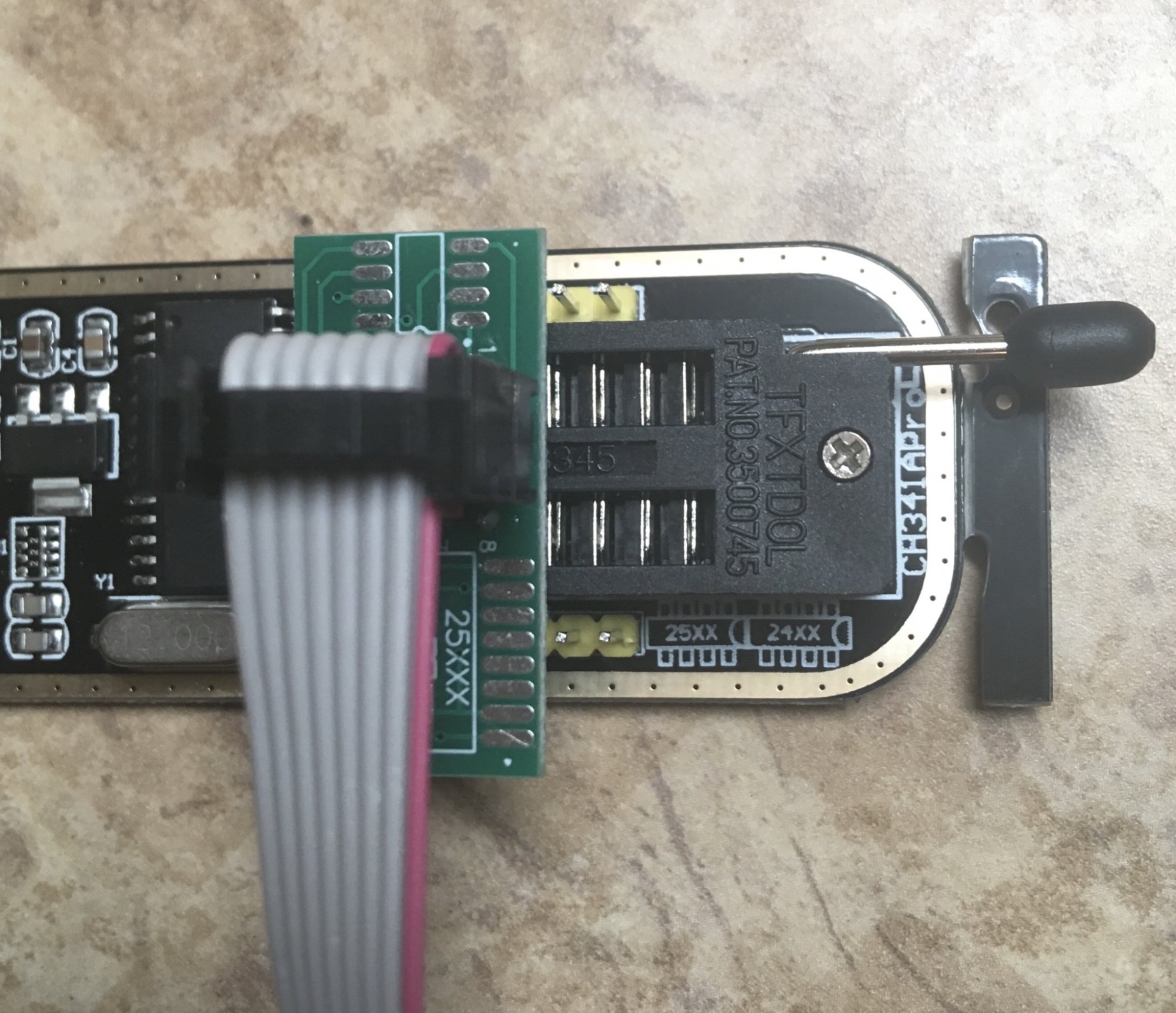 So I attempted to reflash with a programmer + clip, but the one I have was not making a solid connection. Looking at the construction of the one I got, I’m shocked it could work at all.