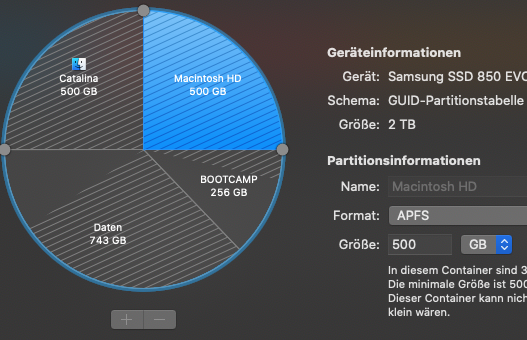 After installing Catalina next to High Sierra and the messy Bootcamp I ended up with 2 APFS containers, 1 physical volume for data ("Daten") and the Bootcamp partition.