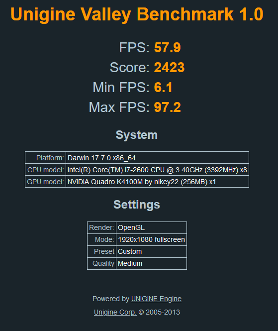 Once I reassembled I booted straight to W7 and fired up nvidia inspector and gpu-z and the card was getting to P0 865 MHz, so I booted to HighSierra and ran Valley which hit 60 fps.