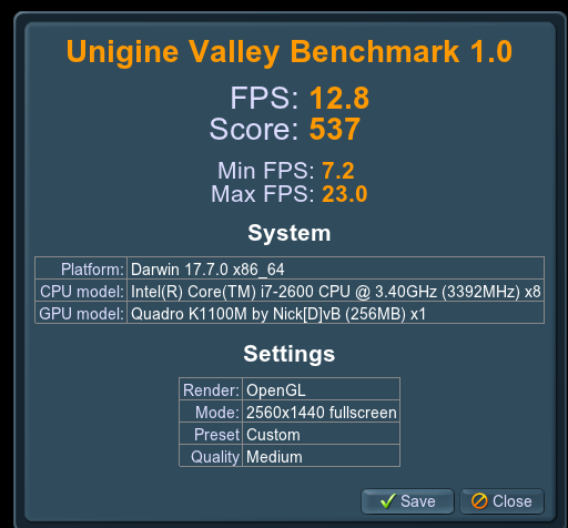 known issue with High Sierra, rerun valley with the settings mentioned on post #1 to compare with submitted results.Here are my results. I am puzzled by the amount memory Engine reports on my card. 256mb? I searched here and dint find any comments but Google show some people claiming that its a known problem with Unigine especially on Nvida cards. Does anyone know if that's true? Or is that result typical for my setup?