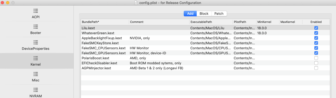 Kernel. Make sure the first 6 kexts are checked. UNLESS, you have a Nvidia card and you installed kexts when setting up your card (namely Sandybridge and Sleep). In this case, uncheck the first two (Lilu.kext and WhateverGreen.kext). If your computer hangs after the OpenCore Bootloader, this is why.